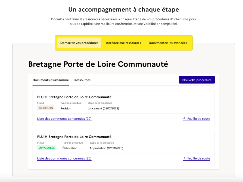 ### L'arrivée sur [le site de Docurba](https://docurba.beta.gouv.fr/) est améliorée et permet d'orienter avec plus de précisions les personnes qui souhaiteraient se saisir des différentes fonctionnalités.