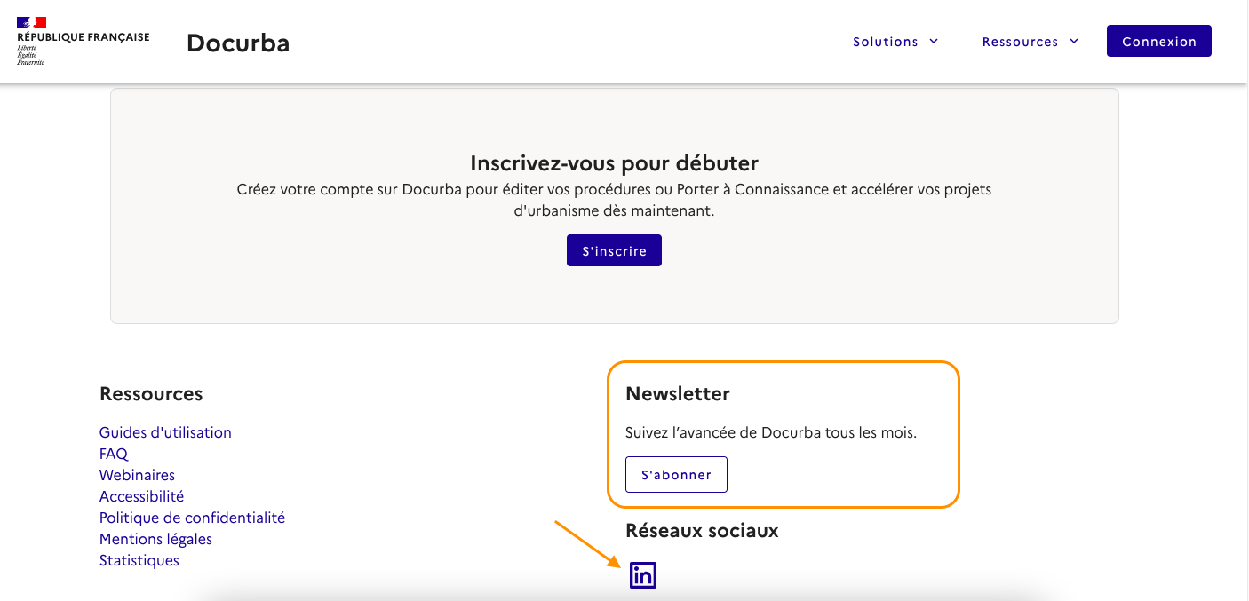 #### Un champ d'inscription à notre lettre d'informations mensuelle & le lien vers [notre page LinkedIn](https://www.linkedin.com/company/docurba/) : **suivez-nous !**